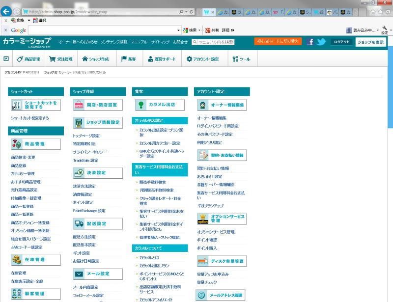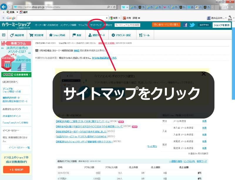 カラーミーショップのサイトマップは、メニューの数が多くてはじめは使いにくいのですが、半ば強制的に毎回サイトマップを使うことで、その配置には慣れていきます。