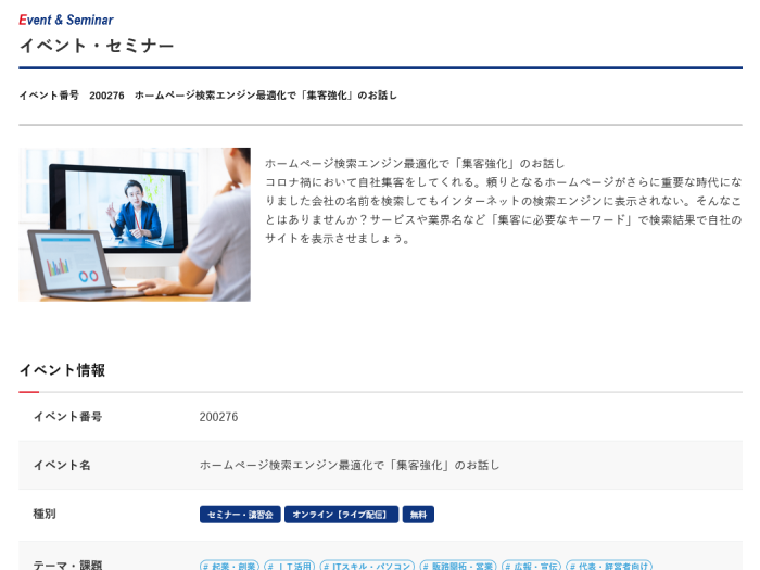 2022年6月15日 東京商工会議所 オンラインセミナーのお知らせ 【 2022年6月23日(木)14:00~16:00 】 東京商工会議所 オンラインセミナーを行います。 イベント名:ホームページ検索エン… 続きを読む